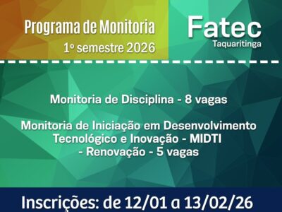 Direção da Fatec Taquaritinga faz saber que estão abertas as inscrições para o processo seletivo do Programa de Monitoria do Centro Paula Souza (CPS). As disciplinas e o número de vagas foram distribuídos….. Confira o […]
