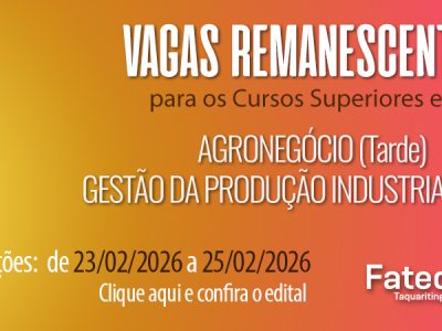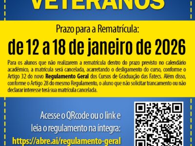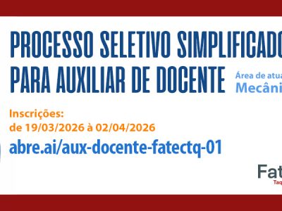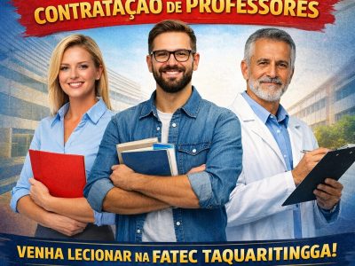 ABERTURA de inscrições de Processo Seletivo Simplificado DETERMINADO, para a função de AUXILIAR DOCENTE na área INFORMÁTICA na Fatec Taquaritinga INSCRIÇÕES: 02/02/2026 até às 23h59 de 16/02/2026 Para inscrever–se, o candidato deverá: a) acessar o site https://urhsistemas.cps.sp.gov.br/dgsdad/selecaopublica b) Clicar em FATECs > PROCESSO SEL. […]