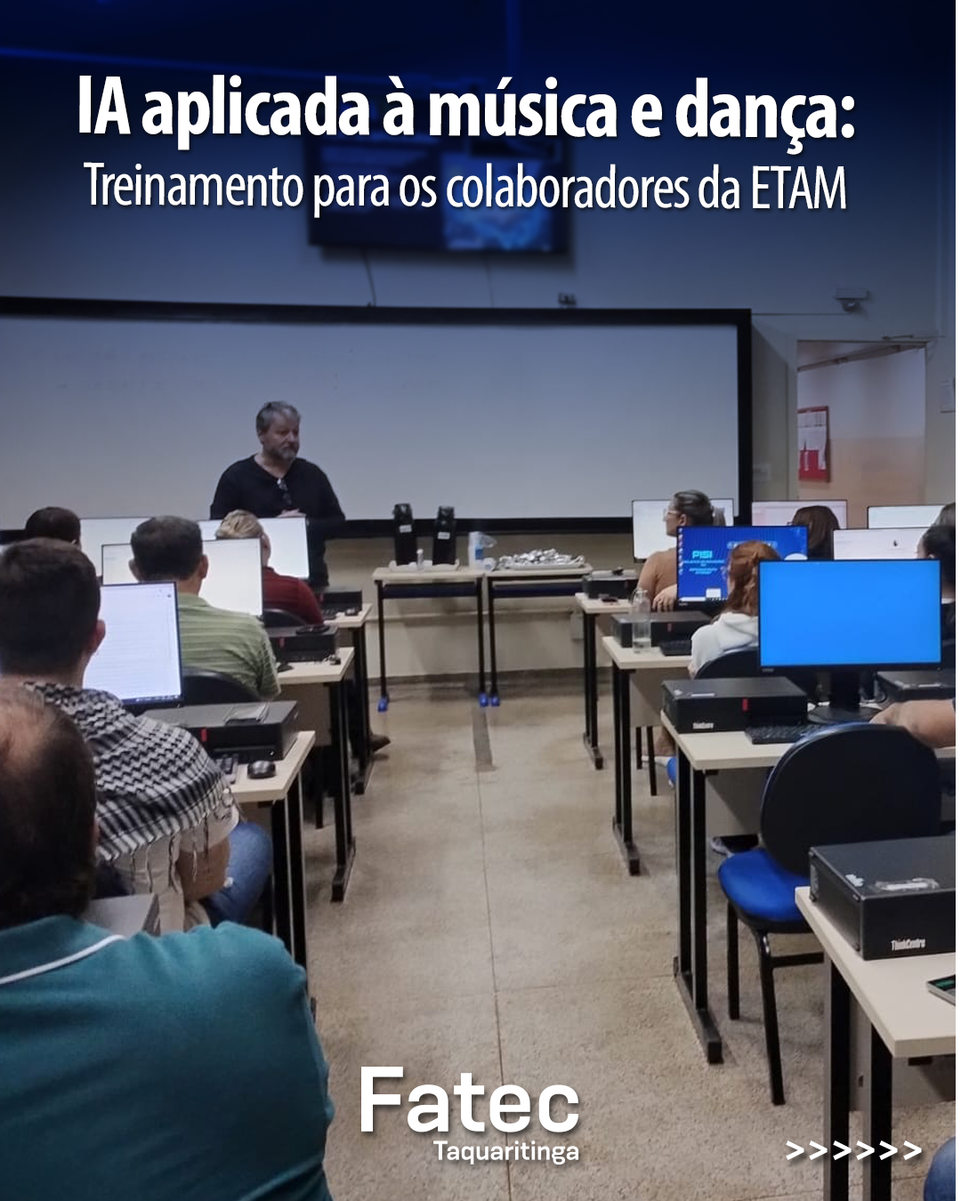 Na última terça-feira (01/07), a Fatec Taquaritinga recebeu os colaboradores da Escola Técnica de Arte Municipal Santa Cecília para um treinamento com foco na aplicação da Inteligência Artificial nas áreas da música e da dança.