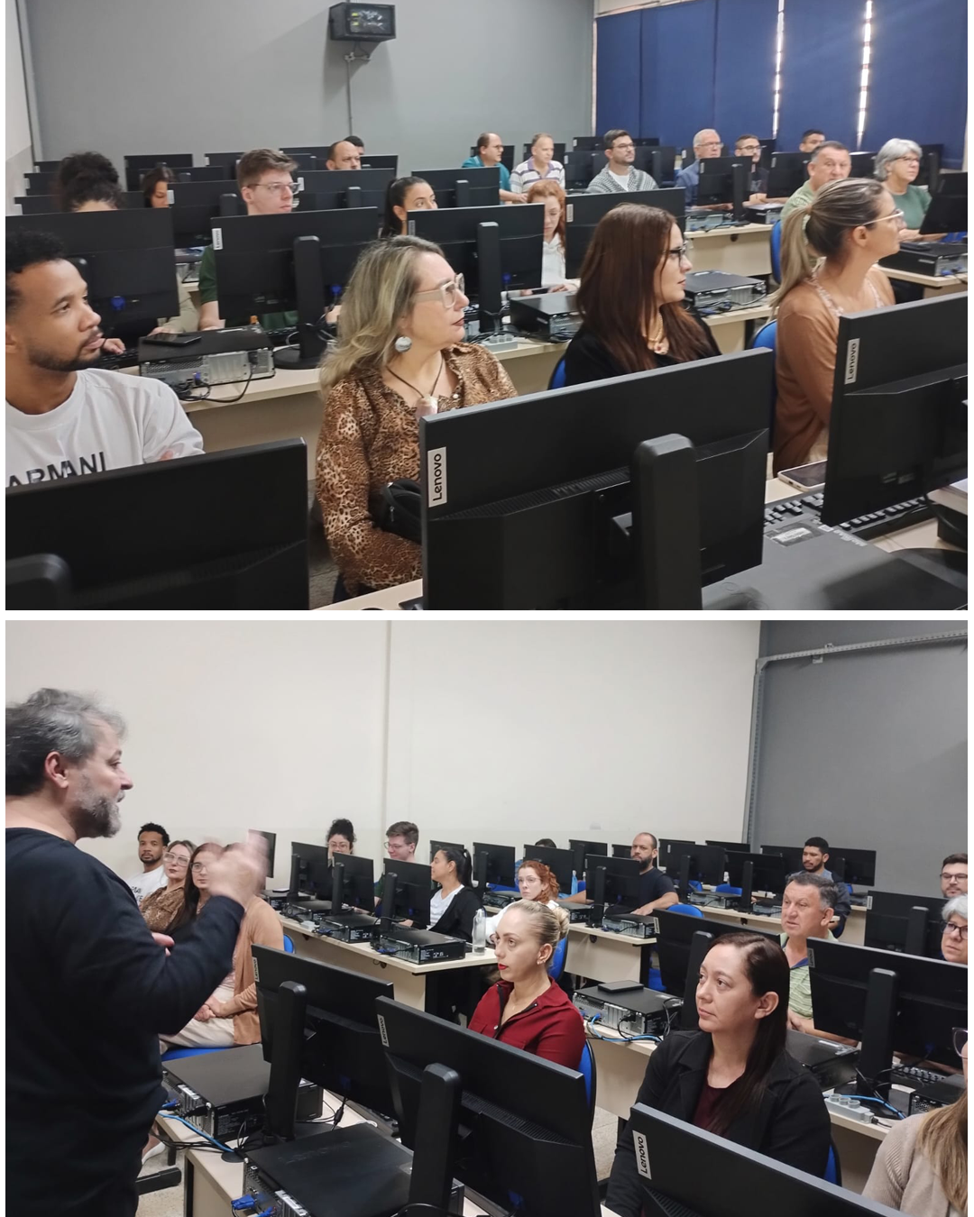 A atividade foi conduzida pelo Prof. Dr. Marcus de Oliveira, que apresentou diversas possibilidades e inovações que a IA pode proporcionar nesse campo artístico, promovendo reflexões sobre o uso da tecnologia no processo criativo e na produção cultural.
